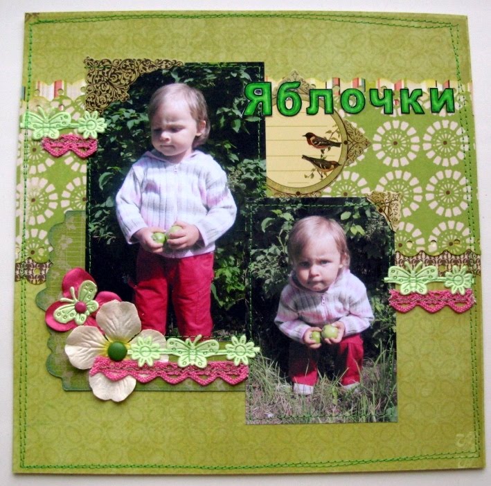 Юля, разворот очень нравится!!! Такое яркое, сочное сочетание цветов, и брадсик-яблочко - всё так здорово!:)))